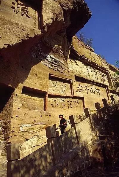 千百年来,边关战将、文人墨客但凡来到榆林,便要在此饮酒赋诗,宏伟的石崖壁上布满了星罗棋布的石刻题匾和大大小小的洞窟,留下多幅宝贵的书法艺术作品。题刻中有晚清名将左宗棠所题的对联,革命先烈杜斌丞题刻的“力挽狂澜”,字迹苍劲,功力不凡。“红山夕照”被誉为榆林八景之一。