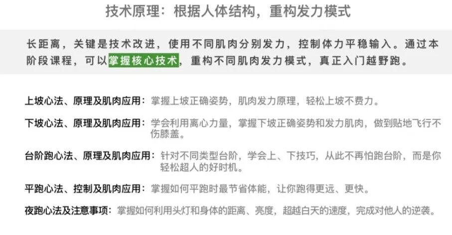 根据越野跑核心心法,重构发力模式,找到上坡、下坡、平跑、台阶、手杖、装备等的正确使用方式。