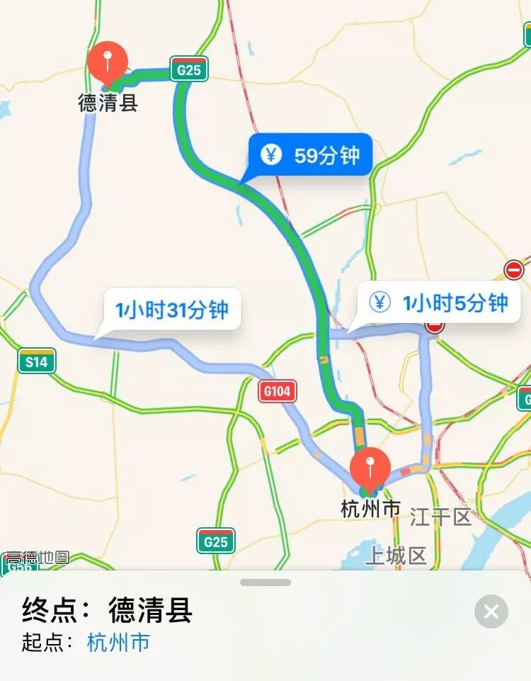 从杭州到德清总路程40公里左右,车程约1小时,过路费约15元。如果有4-5人,合伙租个车价格也不算贵。