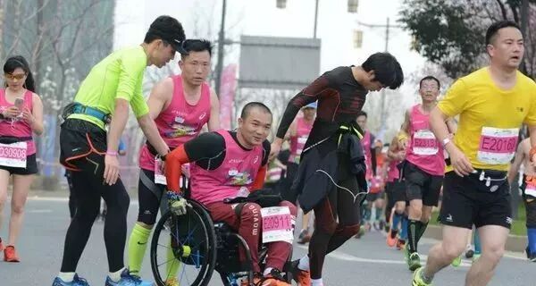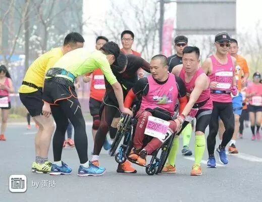 3月25日的锡马赛道上,26公里处,王璟轮椅右大轮的插销松脱出来,尴尬地停在了赛道上。路过的几位跑友主动停下来询问情况,协力帮王璟安装好插销。确认没问题后,大家微笑着互相说加油,继续出发各自奔向终点。