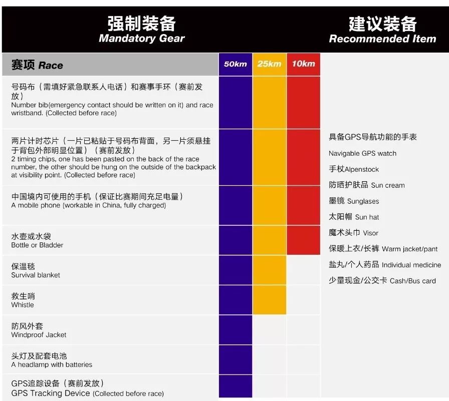 入场检录时需通过强制装备检查,缺少强制装备的选手,组委会将强制选手终止比赛,选手号码布上做退赛标记,回收计时芯片。